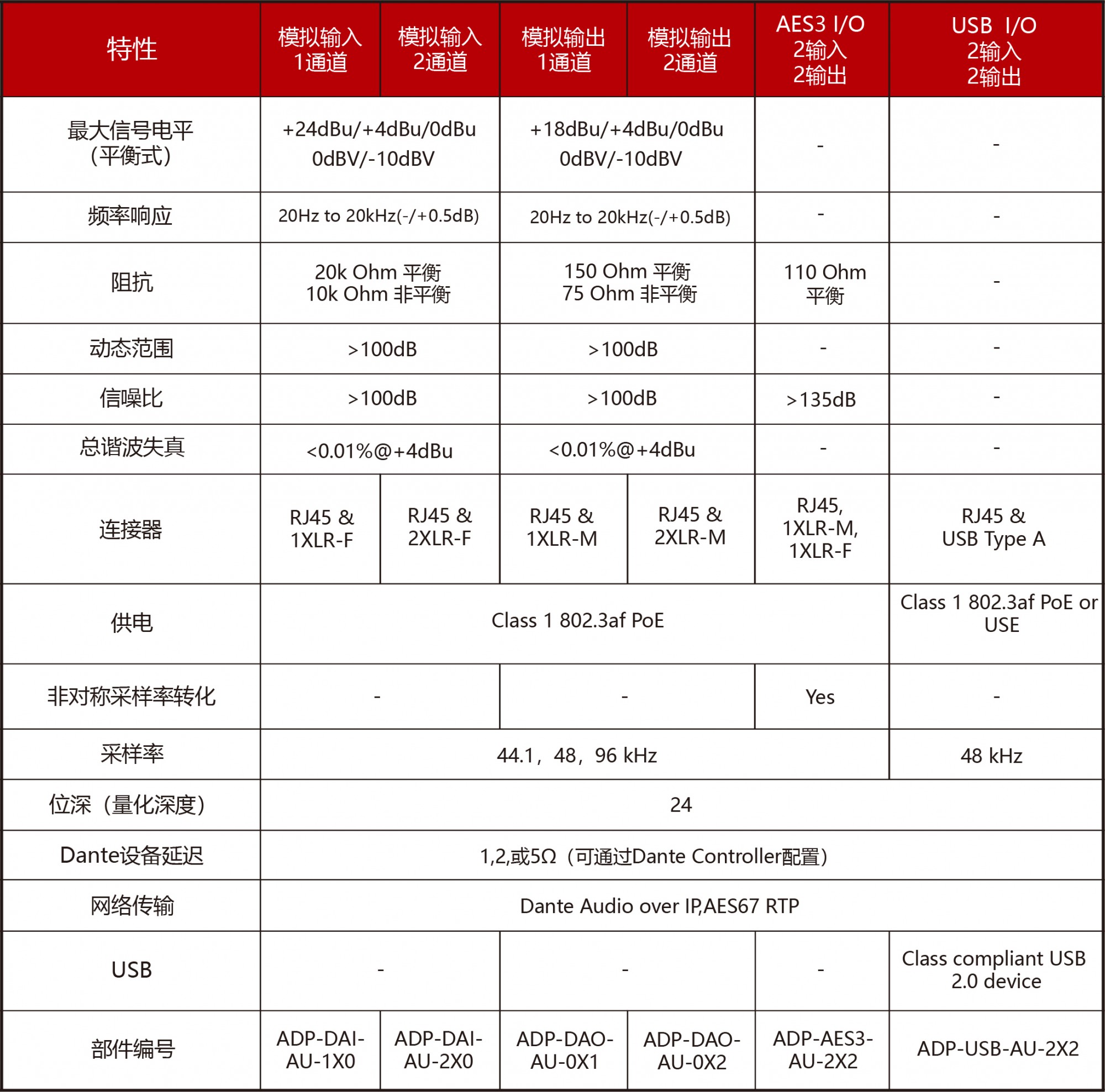 Dante AVIO适配器具备四种型号,包括模拟输入和模拟输出适配器的1通道版本和2通道版本。