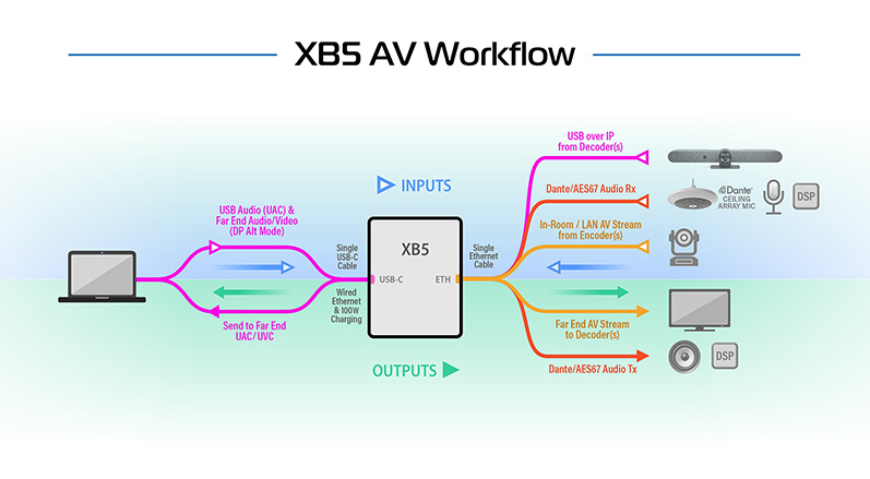 XB5支持UVC(USB视频类)和UAC(USB音频类)标准,可原生兼容Windows®、macOS®和ChromeOS™系统——无需驱动或软件。它能够与 Microsoft Teams®、Zoom®、Google Meet®、Webex® 等领先的 UCC 平台立即实现互操作,让用户能够即时加入会议,同时利用会议室的联网音视频资源。连接后,XB5 将用户设备与支持 Dante® 和 AES67 的麦克风、扬声器、DSP 和显示器相连接,在任何软编解码器会议期间,用户都能完全控制和使用高性能音视频硬件。
